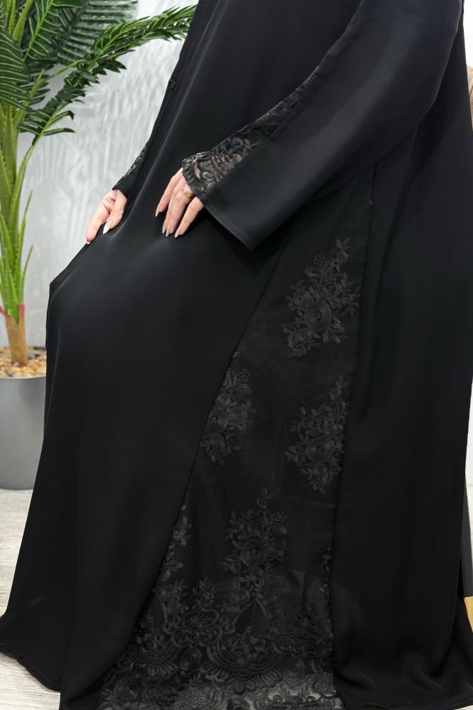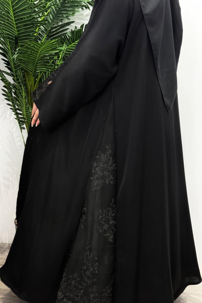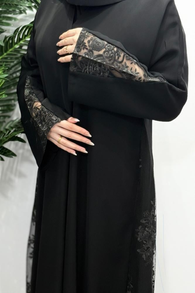 عباية فخمة من همسة لينا هي الخيار المثالي لكل سيدة تبحث عن الفخامة الممزوجة بالاحتشام لتتألق في المناسبات المميزة ، حيث صُممت هذه العباية باللون الأسود الكلاسيكي مع لمسات الدانتيل المزخرفة على شكل ورود على الجوانب والأكمام لتضفي لمسة أنثوية راقية على إطلالتك ، فضلا عن خامة الإنترنت الكوري التي تضيف راحة عملية وانسيابية ، بينما تمنح القصة النص كلوش مظهرًا أنيقًا وحركة جذابة ، بفضل تصميمها المقفل بطقطق مما يجعلها عملية وسهلة الارتداء.